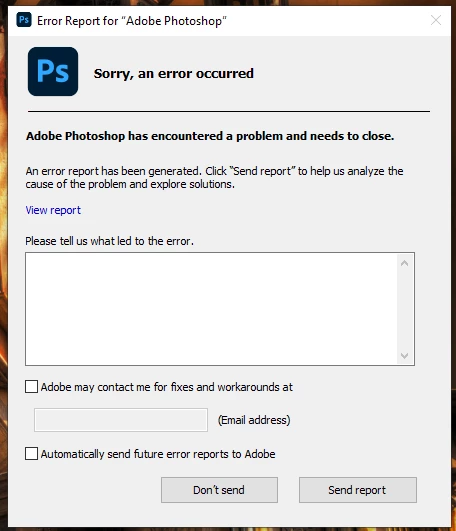 After insert an image/photo in jpg - photoshop show me the information about error and shuts down my program. It happens any way I try to put the image. By cursor or by open a new blank file, every time I am trying to put image.