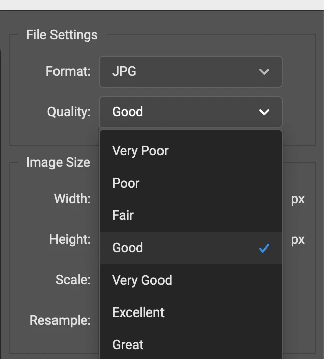 • For a very large JPEG graphic optimized for the web or mobile, use Export As.