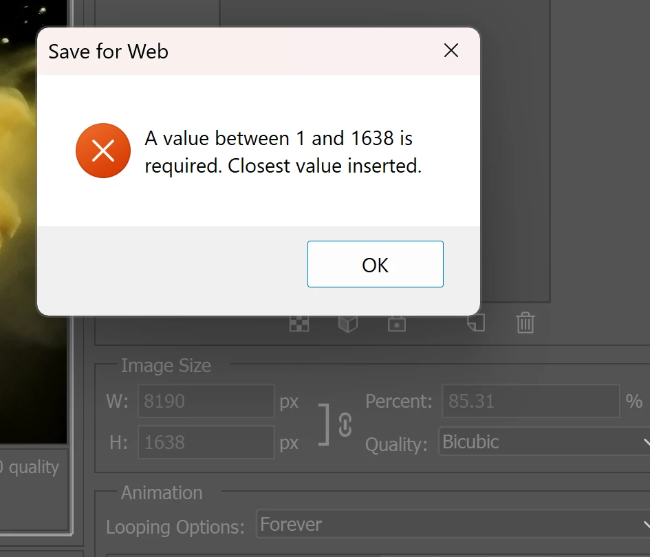 The dimension limitations for Save for Web are 8192 × 8192 pixels. That is why a long dimension above 8192 is reduced to 8192. The limit exists because Save for Web is very old code, and that is why Adobe has named it Save for Web (Legacy). They want to remove this old command eventually.