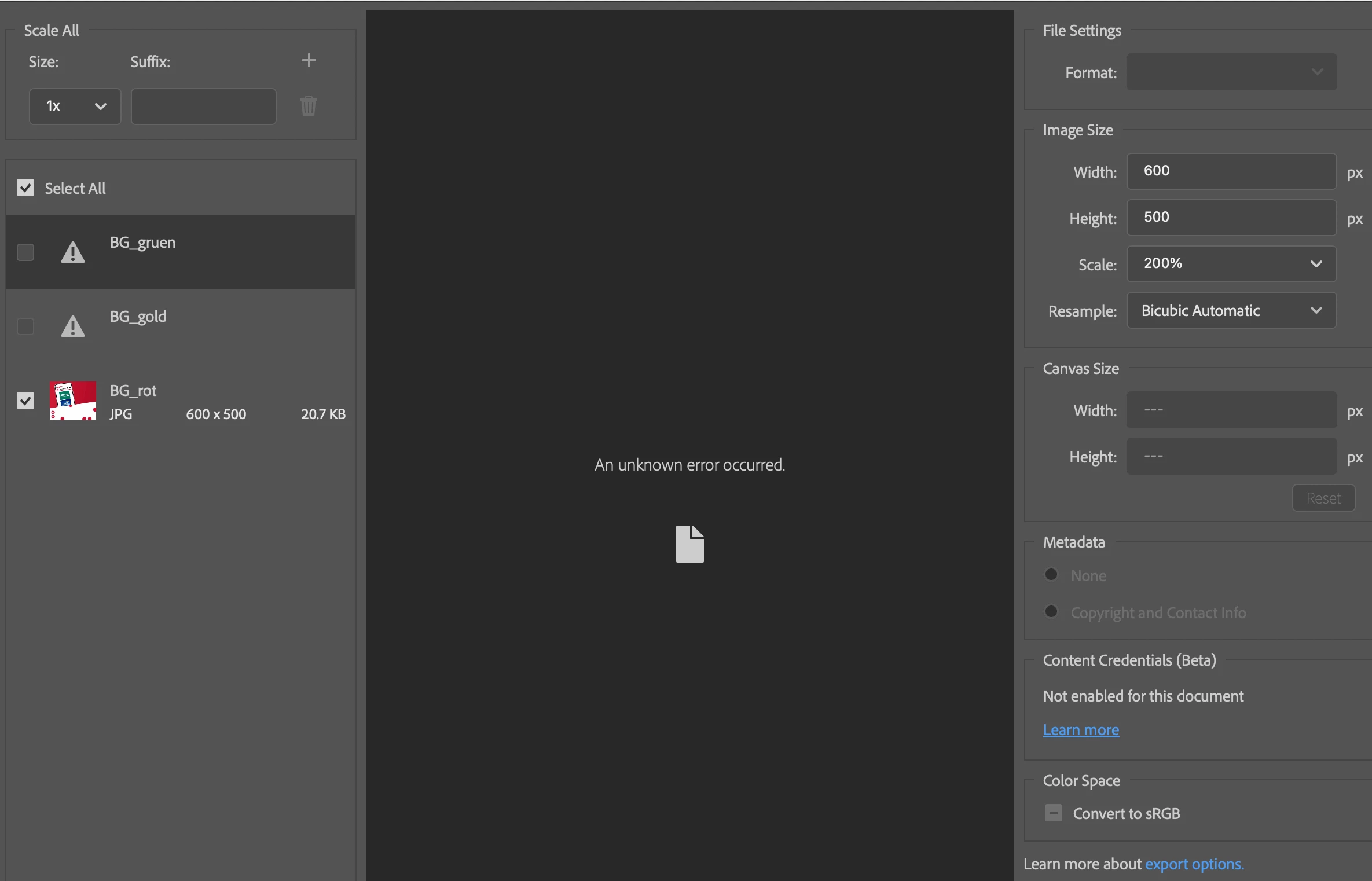 When I try to select an Layer and do "Export As", Usually an unknown error occurs.
