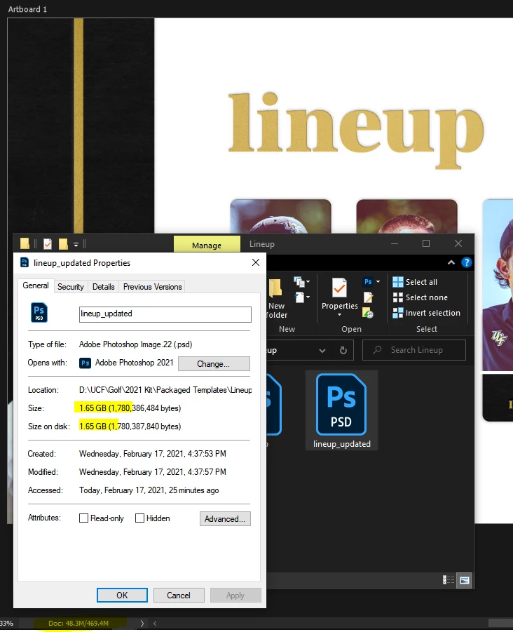 I'm running into a strange error with a project I'm currently working on. In the bottom left corner of the Photoshop window, where it shows your document size, PS is telling me that I'm currently at 469 MB. However, upon saving out, the file ends up at a whopping 1.6 gigs.