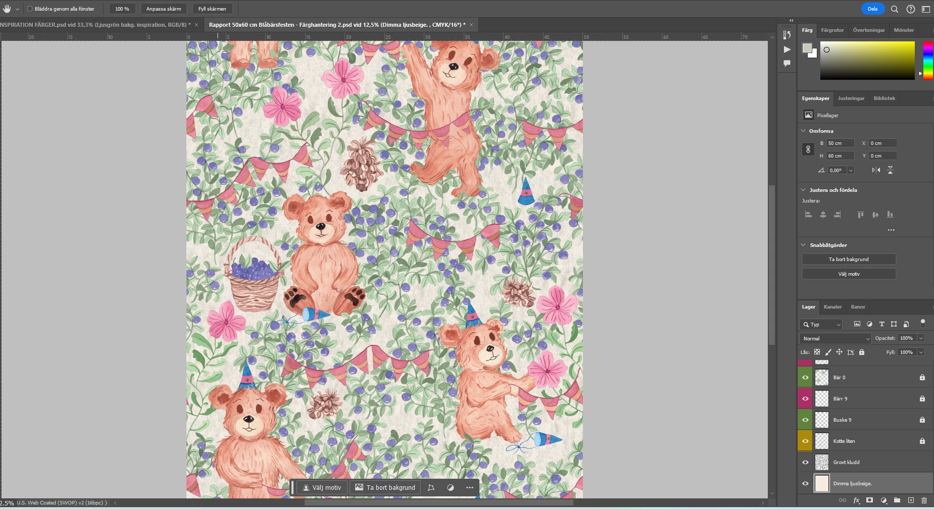 Mainly because of layers in the background, behind the illustrations of teddybears and blueberries, there are layers with hand drawn "structures" I have drawn and scanned into the computer.