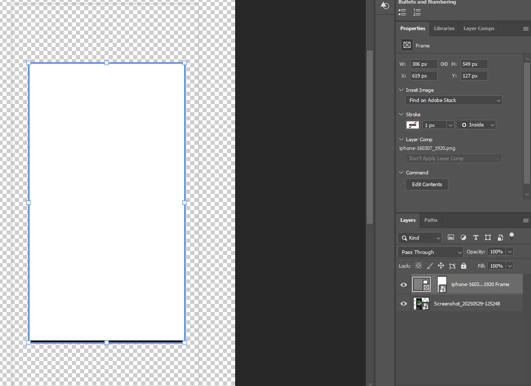The frame tool doesn't seem to be working like it used to. I'm trying to place a frame in the white part of this image. Usually, I just need to use the frame tool to draw a rectangle over the part where I want to embed images. But now, doing so turns the phone image into the in-frame image instead of the frame.