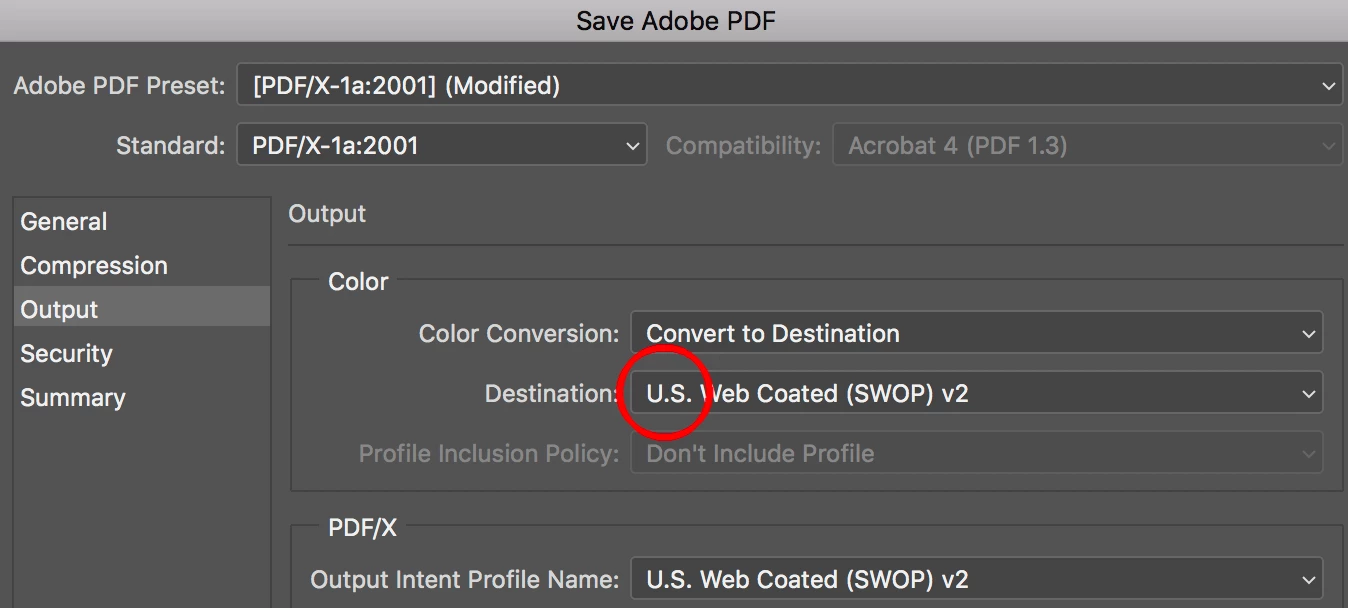 I save the file with "Color: Embedded Color Profile: SWOP (Coated), 20%..." checked "on" in the save screen.