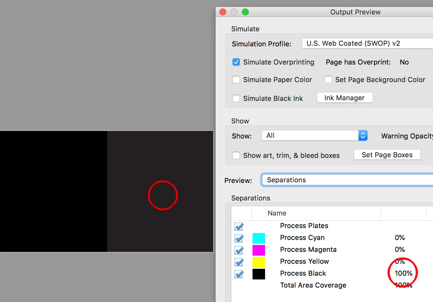 Open this same PDF in Acrobat. Open Print Production>Output Preview - Simulation Profile: U.S. Coated (SWOP) v2 >Preview "Separations"