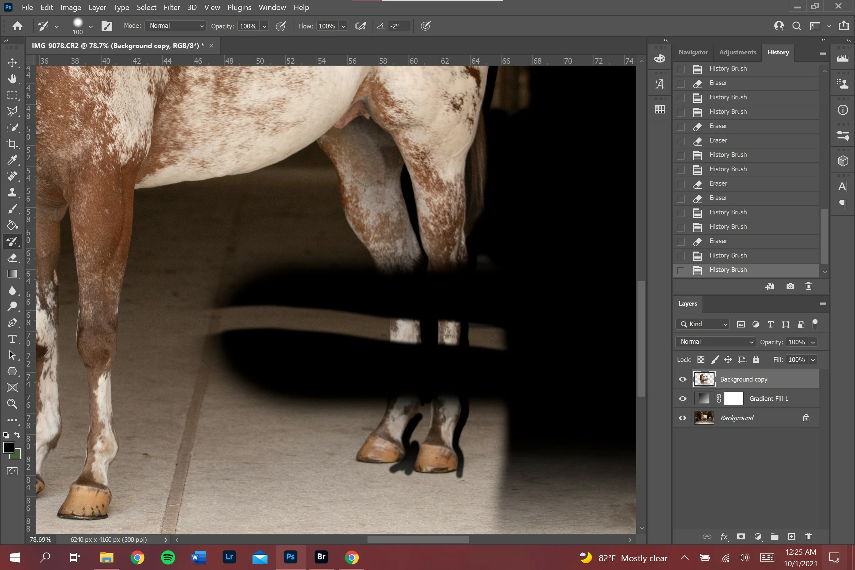 I am on version 22.5.1 of PS through creative cloud. The history brush tool is not functioning properly. It will only restore certain parts of the image. I am using the erase tool to cut out my subject, but when I try to use the history brush to restore part of my subject, it will not work. However if I create a new erase stroke, it will restore that, just not any stroke I've made previously. Ive tried deleting the file and reuploading it, but that did not work to solve the issue. I included ascreenshot of what I am seeing. I made a new large erase stroke and used the history brush straight through it, and it didn't not restore any of the previous erasing I did around the horse's legs.