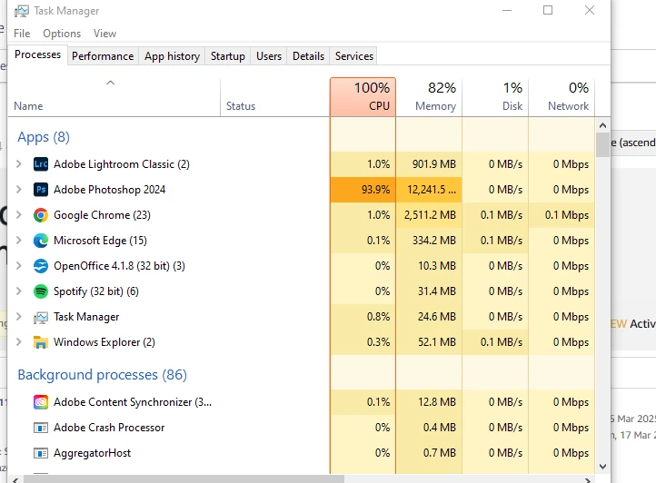 I know PS hogs memory for absolutely zero reason and has done for the 20 years I've used it - no other program does this, there is literally no excuse. But now it decides to hog CPU use as well, 94% to be exact while doing NOTHING, in fact the PC had been left for 12 hours idle but PS still manages to hog 12GB memory and 94% CPU with zero files even open. What an absolute dire piece of coding this is - I am desperately seeking an alternative that will work with PSD files. 20 years, many different systems, many different PS versions but still the same old ****