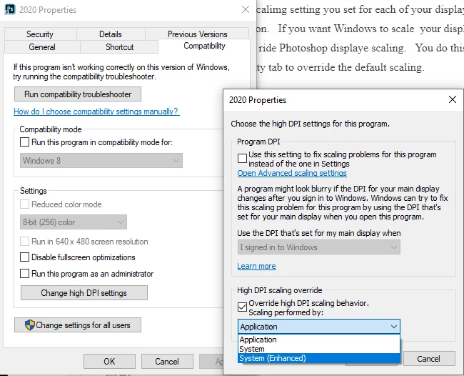 Hi! my company uses CC and I have recently downloaded CC 2018 for each of the Photoshop, Illustrator, and Indesign programs that we use. I have two monitors: my laptop, which is a Lenovo Yoga with 4k display and the recommended (and preferred) resolution set at 3840x2160 with 225% scaling; my external monitor is an Asus with a recommended (and preferred) resolution of 2560x1440 with 100% scaling.