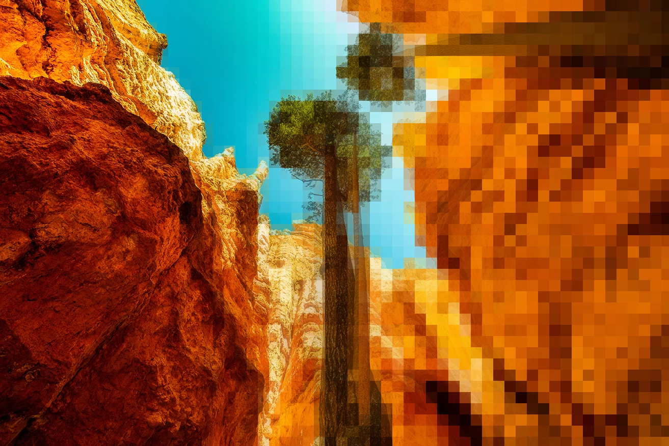 Photoshop image from small pixels on one side of the image to large digital pixels on the other side