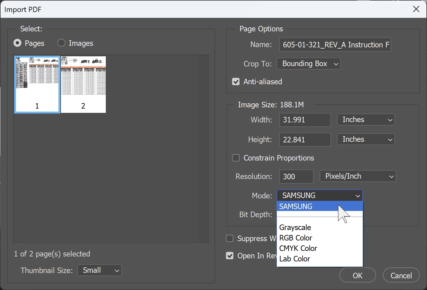 "Mode" selection dropdown which usually contains color mode options like "Grayscale", "RGB", "Lab" and "CMYK". When I open one particular PDF that option defaults to "SAMSUNG". The normal options are still shown in the dropdown. What is "SAMSUNG"? Is that a custom color mode embedded in this PDF? Should I be using the embedded option versus the others?