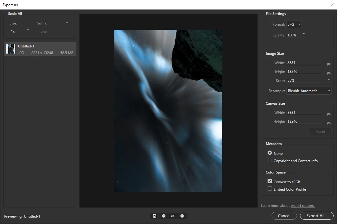 Here is it. Canvas with about 40% of my original photo visible. The way I like it, and the way I want it to export.