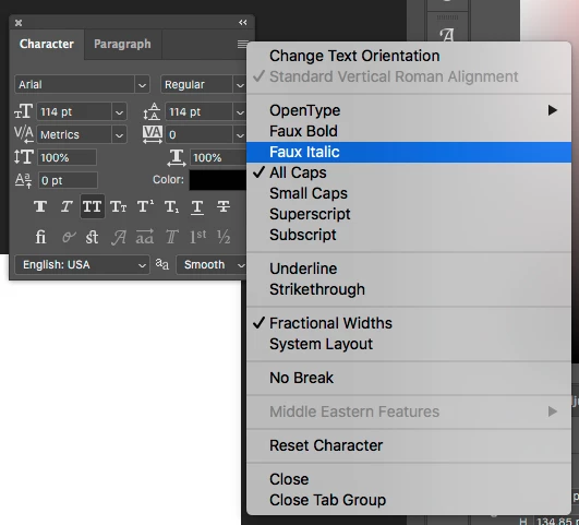 And if you view the Character pop-up menu, do you see "Faux Italic" listed?