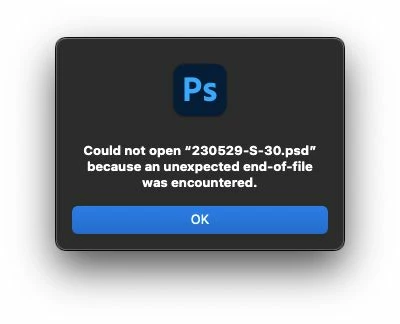 I work on a local network with my team, and lately my Photoshop (version 25.3.1) has been corrupting files as shown in the screenshots. When I try to reopen the file, it doesn't open, and if I preview it using MacOS Preview, a blue stripe appears at the bottom of the file.