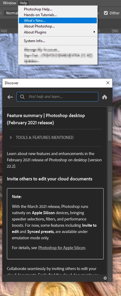 In case you haven’t heard, Photoshop 22.3 now runs natively on Apple computers using the Apple Silicon M1 chip and shows significant performance gains. In addition, we released quite a few amazing new Photoshop features in the last few months. In the Photoshop desktop app, you can navigate to Help > What's New to see the list of newly added features in the Discover Panel.  I’ve listed short explanations and links below for some of the key features we have added since October 2020 so you can learn more about each topic and try them for yourself.  You can also check out the additional helpful links at the bottom.