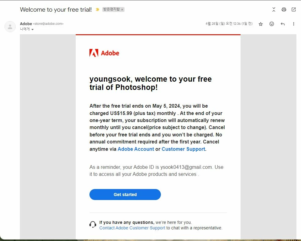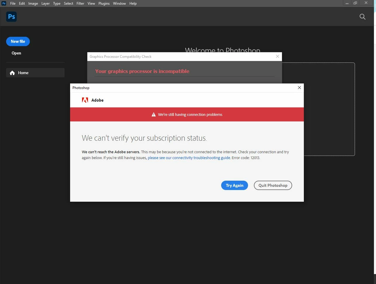 I applied for a free trial before purchasing Photoshop and received a confirmation email from you. I have already entered all my card information. However, as you can see in the file I captured and sent, Photoshop does not open, so I cannot use it. I also want to check my account and cancel the free trial, but an error message pops up and I can't do anything.