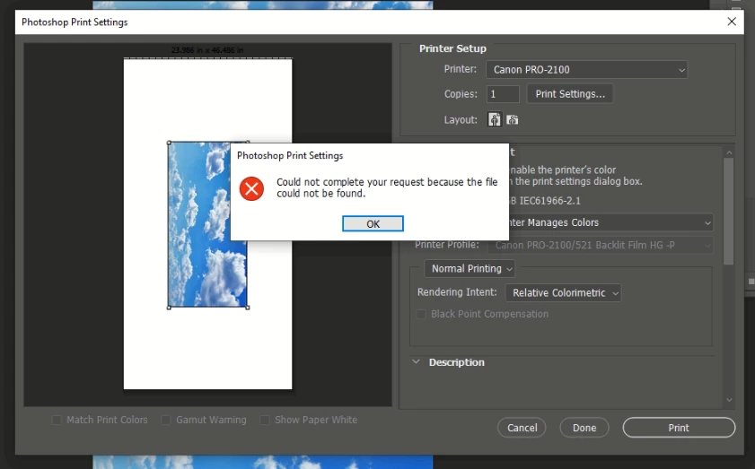 Photoshop Print Settings - Could not complete your request because the file could not be found.