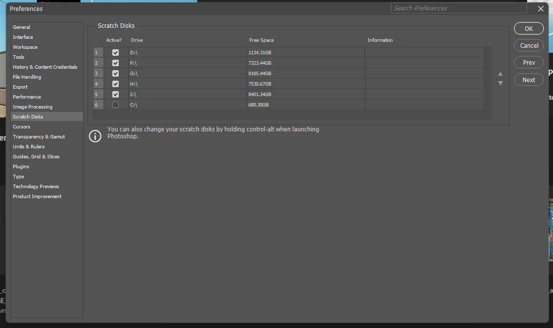 Photoshop quits when using the Quick Selection Tool in large documents (around 12+ GB). This was happening recently with the Move tool when I discovered that I didn't have the latest version of PS, and updating that solved the problem. Not so this time. For context, Windows became corrupted recently and I took my laptop in and Windows was repaired. (I don't know that my problem is Windows-related.) After the crashing of PS using the Quick Selection tool I took the laptop back in and was told that I didn't have sufficient RAM, and went from 32 GB to 64 GB of RAM. But it's still happening. I checked my Scratch Disks and saw that - presumably after resintalling Windows - the system had reverted to using my C drive as the Scratch Disk, where my system files are stored. I use a RAID system and also have an internal SSD of 2 TB. I reselected these drives (all but my C drive) as the Scratch Disk drives and I'm still crashing. An image of how I have Scratch Disks selected as well as my System Info is pasted below. One last thing - I don't think the file is corrupted becasuse I tried a file of comparable size and it's still happening. I'm not having the issue in smaller files. If anyone has any thougths about why this is happening I'd appreciate hearing from you.