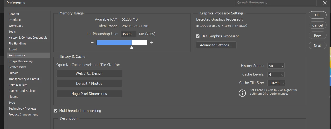 Memory available to Photoshop: 51280 MB
