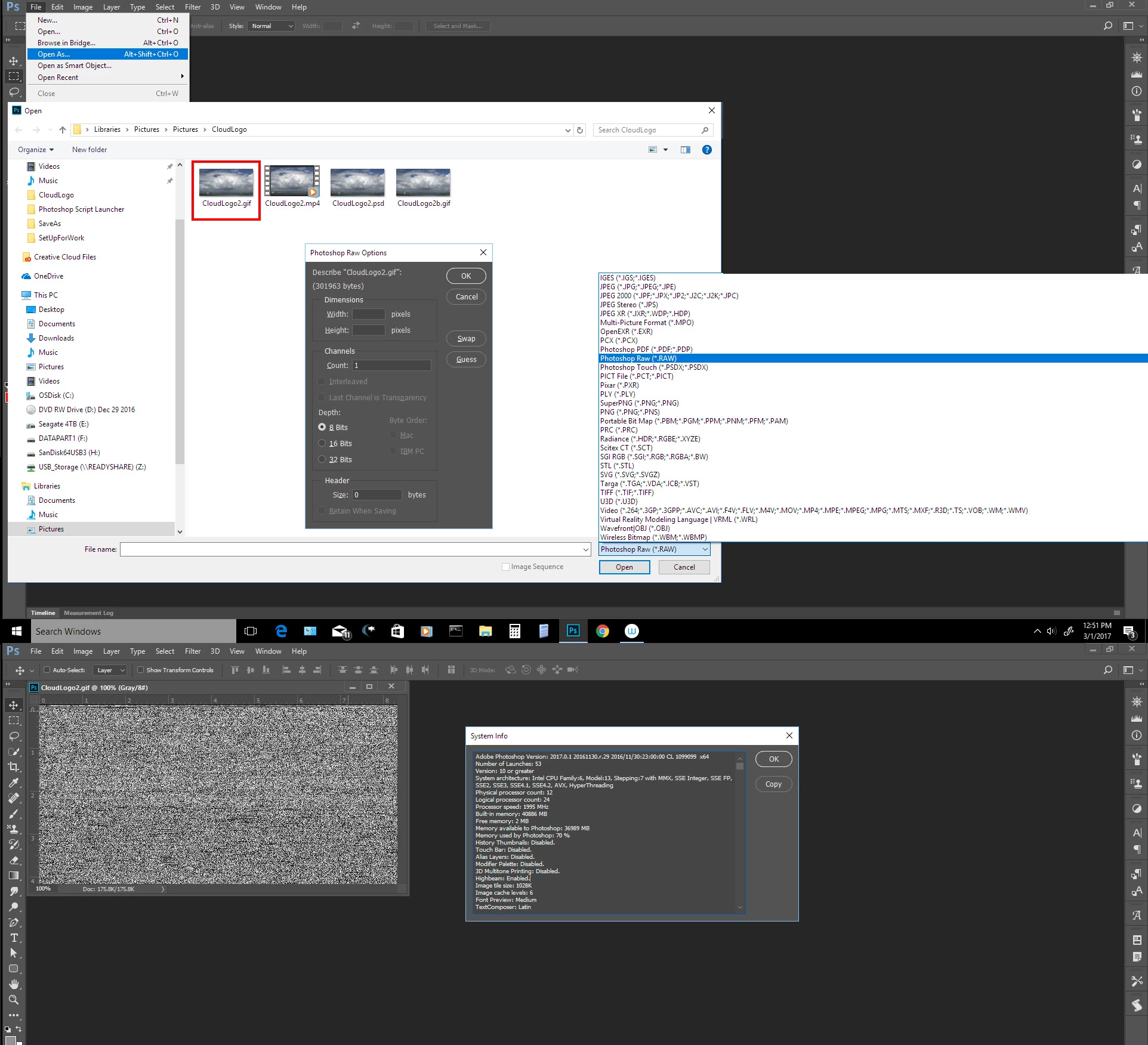 I have Photoshop CC 2017 running on an instance of Windows 7 that is unable to open a raw file (NOT a camera raw file). When I do "Open As..", select the raw file, and select "Photoshop Raw (.RAW)" as the file type, rather than opening the Photoshop Raw Options dialog box, it gives the error message "Could not complete your request because an unknown or invalid JPEG marker type is found." This particular instance of Windows is running on an isolated network (not connected to the internet). It works correctly on a machine that is on a different network (connected to the internet). I don't understand why it is generating a JPEG error when the file is not a JPEG file and it shouldn't be trying to open it until after the Photoshop Raw Options dialog box has been populated. Can anyone shed light on what might be wrong with the configuration to cause it to skip the Photoshop Raw Options dialog and go straight to trying to open the file?