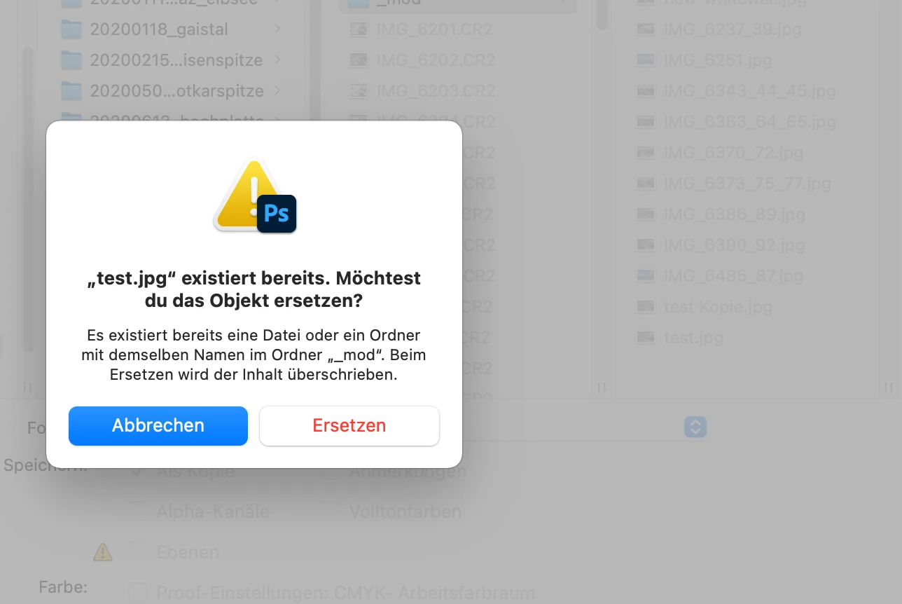 Now the latest state will be saved as 'filename Kopie.jpg' and the previous version will be overwritten. This means: from the MacOS-side everything is fine, as PS definitely has permissions to overwrite files. However, the 'save as' procedure in PS is messued up.