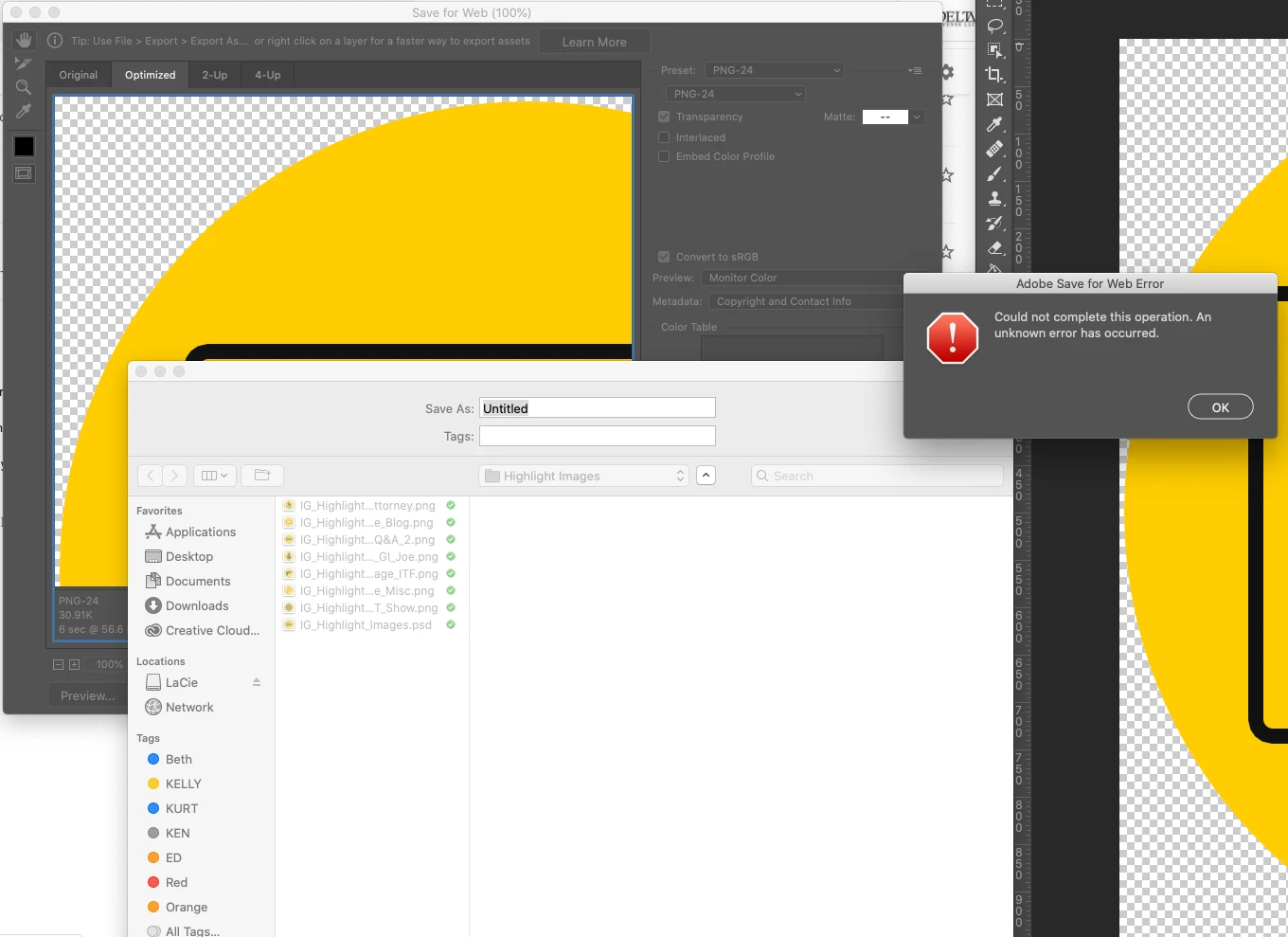 My Photoshop has started to kick back an "unknown error" message when I go to save for web (legacy). I had a coworker open and save for web from his machine and it worked perfectly fine, so I believe this is isolated to my program/machine and is not an issue with the file. I tried restarting my computer as well as uninstalling and reinstalling Photoshop – no luck. Is anyone else experiencing this issue? Or does anyone have a potential solution? I'm attaching an image of the error message for reference...