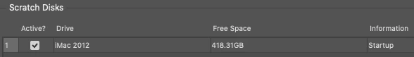 And when I view the scratch disks in photoshop it clearly recognizes that I have over 418GB of storage. I just don't get why it keeps giving me this error. (Also not actually a 2012 iMac, thats just what I named the partition. Its a inside joke).
