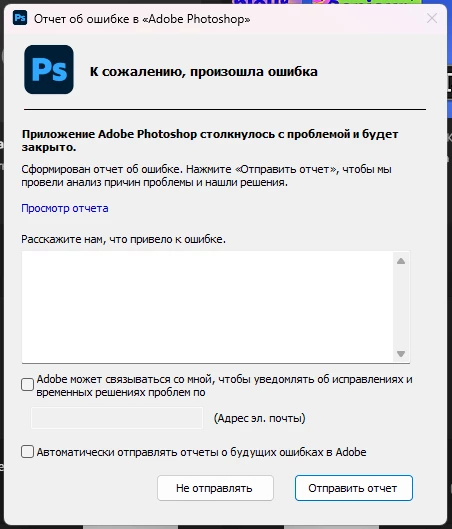 Photoshop stopped opening jpg and png files. Opens only pdf files, otherwise an "Error Report" appears. What could be the problem?