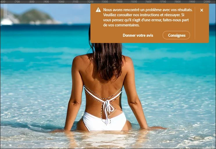To celebrate Photoshop's 35th anniversary, I asked Firefly to create an image of a woman sitting on the beach of a lagoon in a swimsuit with her back bare, which it refused to do on the grounds of “Guidelines violation”.