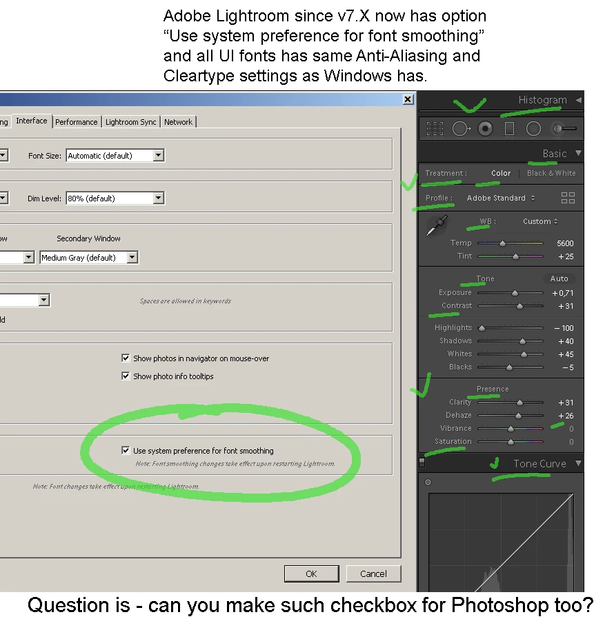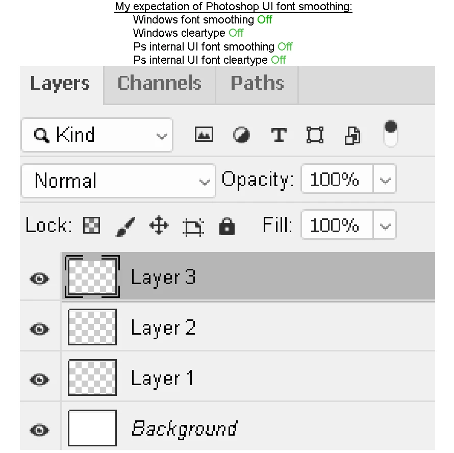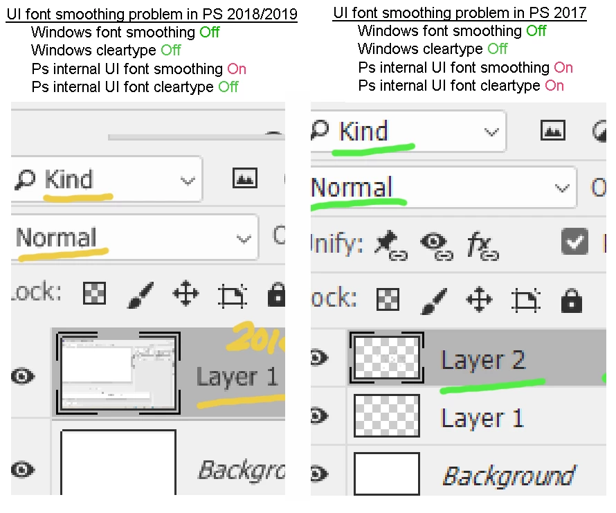 Hi, there is one problem - Photoshop don't respect Windows font smoothing setting for Photoshop UI. I make picture for easy understanding what problem is.