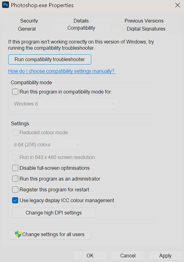 Photoshop V26 appears to be treating my monitor colour profiles very differently from V25. With HDR enabled and identical settings in both versions, V25 displays colours correctly, but V26 casts a blue hue over the image and colour swatches. If I disable HDR, then V26 appears to cast a pink hue over the transparency grid of an image, but the colours are otherwise unaffected. Changing proof setups in V26 has no effect, except for Monitor RGB. This results in the image looking like it does in V26 with HDR disabled, (pink hue to transparency grid only) but the colours in the colour and swatch windows retain the blue hue. V25 reproduces colours correctly with both HDR enabled or disabled. Forcing V26 to use legacy colour management via the Windows compatibility settings resolves the issues, both with HDR enabled and disabled. No blue hue on everything or pink hue on the transparency grid.