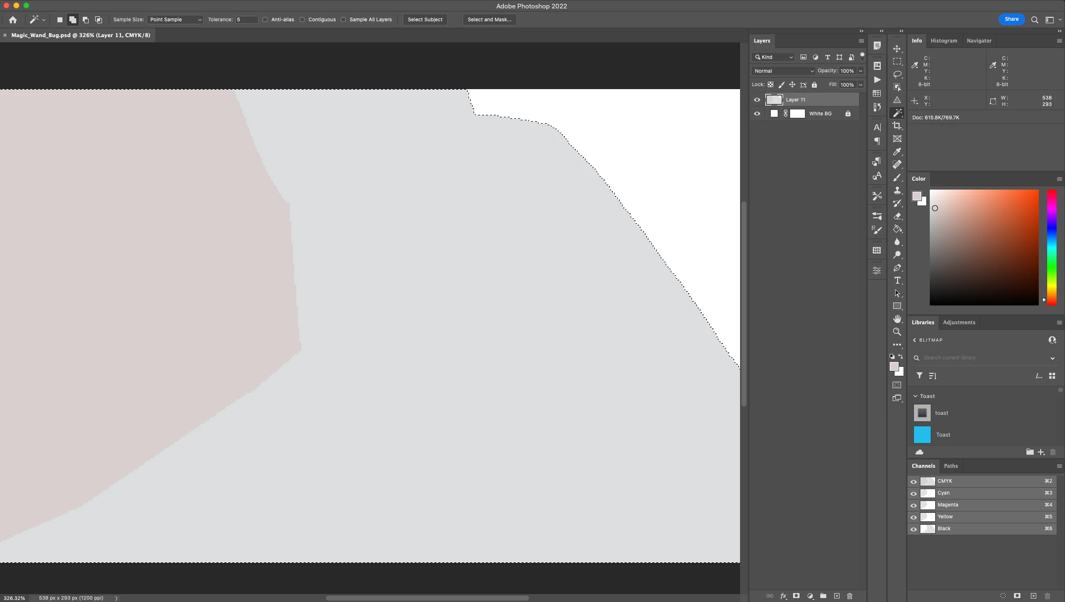 I think there's a bug with the wand tool. I tested it with PS 2022 and 2021.