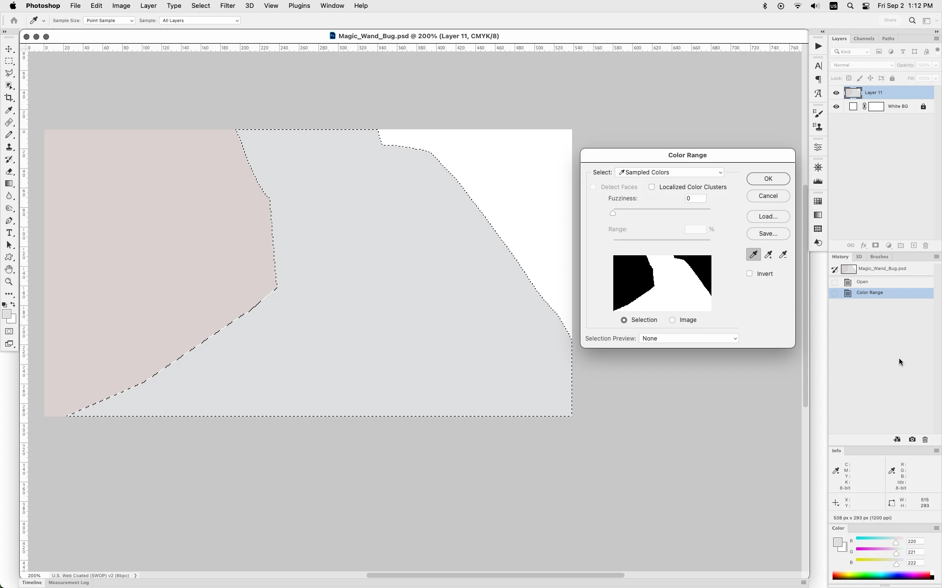 I tried multiple adjustments with: tollarances, contuous, quick-mask, different layers. I also created a new files. Nothing works. The two grays colors are not selecable individually whend the file is in CMYK mode. As an aside The two grays are in the color gamut of the CMYK, one is a 15%K the other is a 15%C 15%M 15%Y