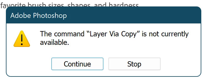 Every time I open Photoshop, whether directly or when importing from Lightroom, Photoshop opens with a series of error messages, "Steve Workspace is not available" (doesn't exist) "layer via copy is not available," "color matching is not available," then another "layer via copy is not available." (see attached jpg for an example)