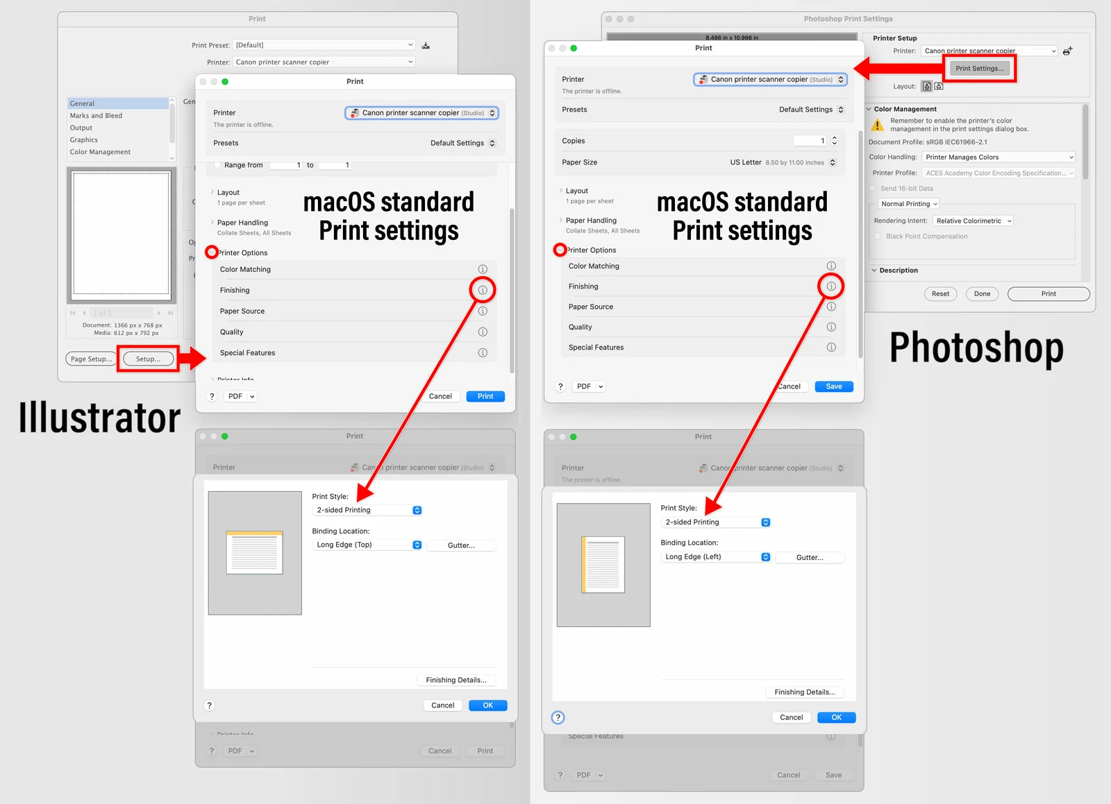 My Adobe Photoshop print window won't allow me to access the printer features for our Konica Minolta Bizhubc250i