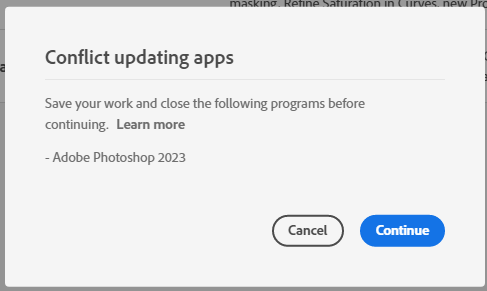 I re-ran CC and got an error message that I need to close Photoshop 2023. But it hasn't been started since restart. If I click Continue I get the same message.
