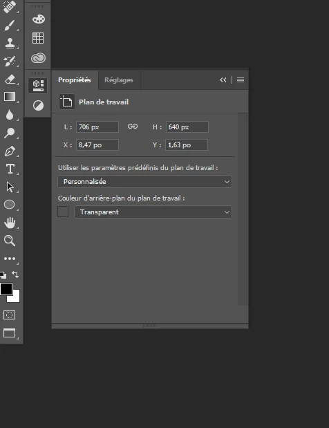 Bonjour, je travail sur un fichier PS CC avec un "plan de travail 1" au fond blanc. Mon fichier final est un overlay transparent et je souhaite retirer le fond blanc du plan de travail pour l'exportation. Malheureusement je n'ai pas trouvé le moyen de changer le fond du plan travail.