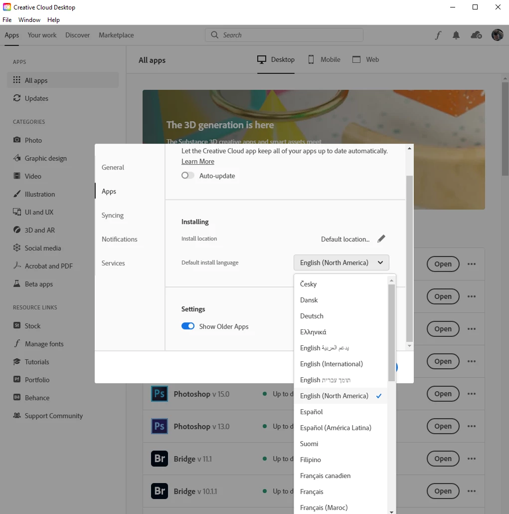 Creative Cloud Desktop application menu File>Preferences then App Language pull down menu