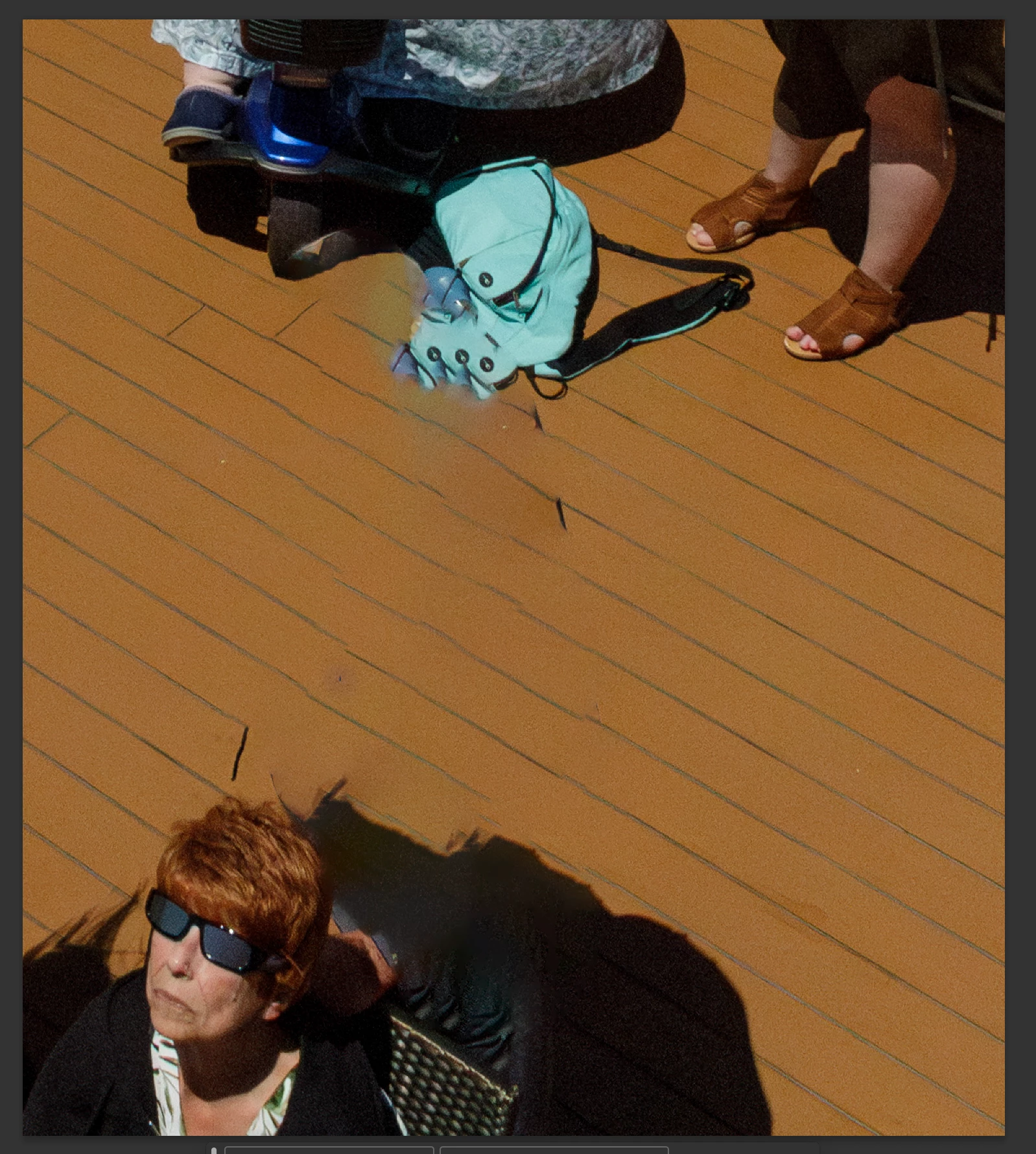 I have a similar image, "Photo B," without the man, that I think will be useful, though the camera wasn't pointed as far downward. Both images are at the bottom of their camera frames: