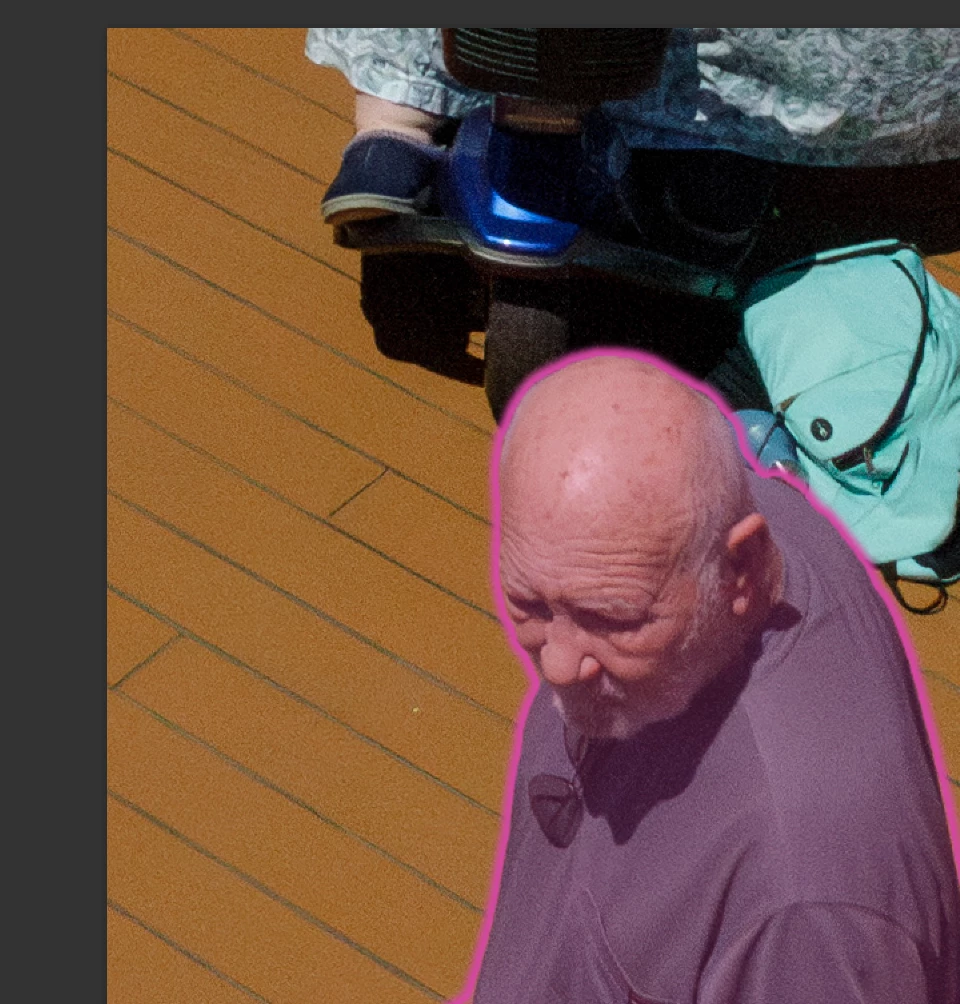 4. The selection is not perfect, so have the Object Selection tool add or subtract regions as necessary. I put the tool into Lasso mode so I could drag around specific areas to add (Shift-drag) or subtract (Option/Alt-drag).