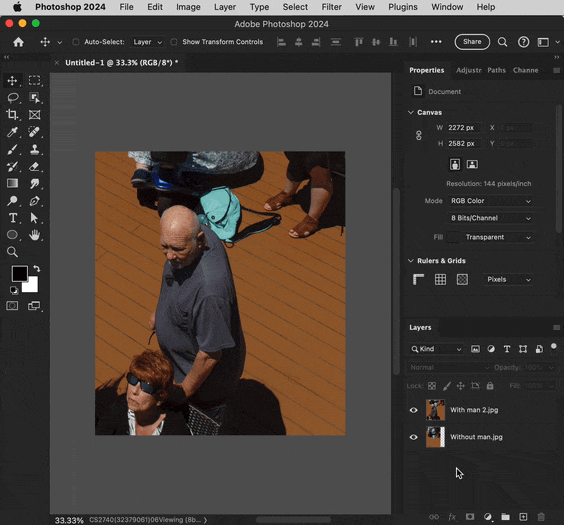 1. Load both images into the same Photoshop document. I used File > Scripts > Load Files into Stack.