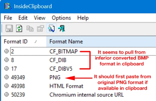 Context: Looking with InsideClipboard after copying an image, you can see when copying a PNG image from Chrome, it puts both the BMP version and PNG version into the clipboard.