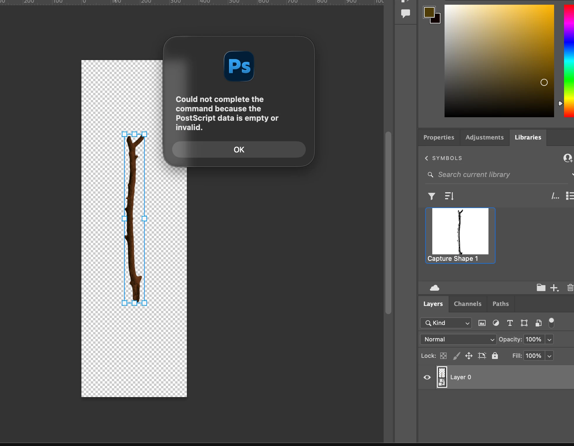 Hi, I have recently been receiving this postscript data error whenever I try to capture a shape. After doing some research in the community, this seems to be a bug that was said to be fixed by updating Photoshop. Upon doing so, it still doesn't work. Does anyone have any fixes?