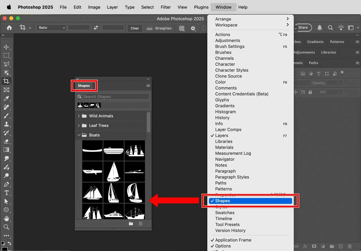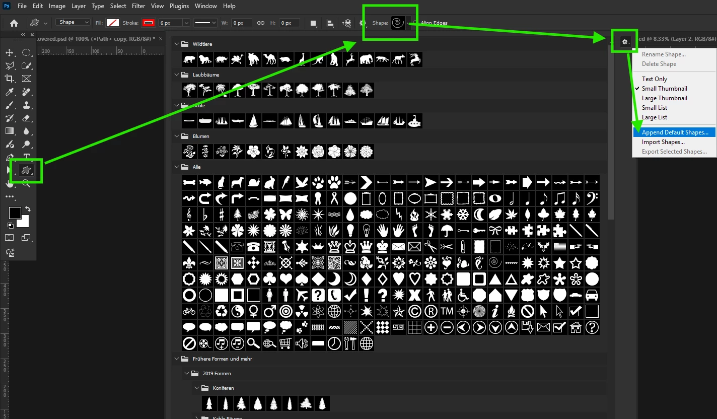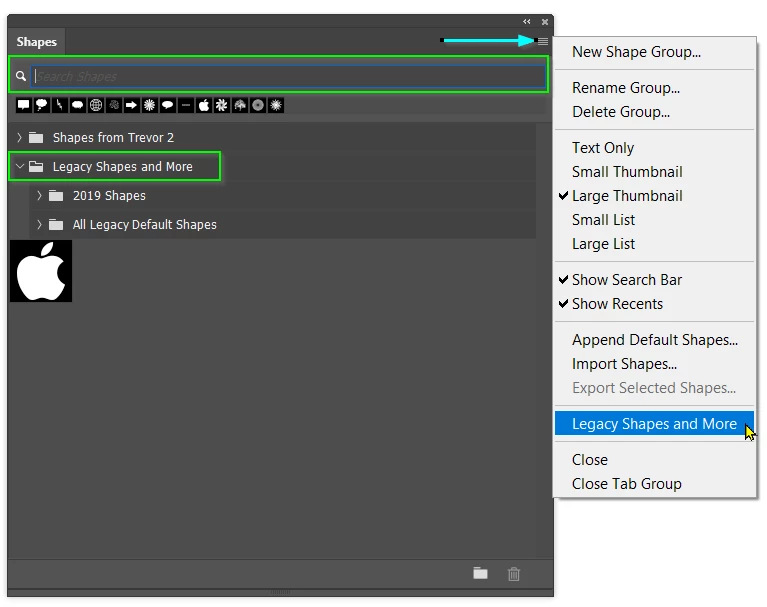 Your best friend with all Photoshop presets and assets is the search bar, because there can be hundreds to look through, and they will be in closed groups so you can browse them as easily as you might like to. However, the search tool will only hunt through groups in its main window, and if my memory is correct, the bulk of the Shapes in Legacy Shapes and More is not loaded by default. You have to load them via the pop-out menu (my cyan arrow top right corner).
