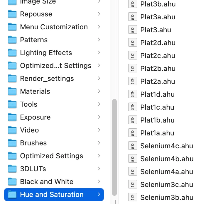 I'm trying to import a raft of custom Hue and Saturation presets from Photoshop 2022 into PS 2024. The files are standard .ahu files, residing in the "Presets" folder in the application submenu. 2024 sees the files, but they are grayed out non-responsive when I tell it to import presets.