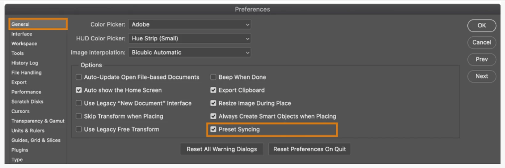 Going on preferences-general and removing the tick from preset syncing, a confimation window appears but photoshop goes again in crash and I'm not able to conclude the operation.