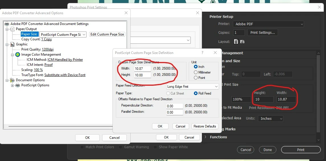 In the Acrobat PDF settings, I set a custom page size to 10.87 x 10. But in the preview window in Photoshop, it shows 10.861 x 10. I cannot get it to be 10.87 no matter what even though the correct dimensions show up in all dialog boxes. Then when I hit print, I get the pop up that "The image is larger than the paper's printable area; some clipping will occur."