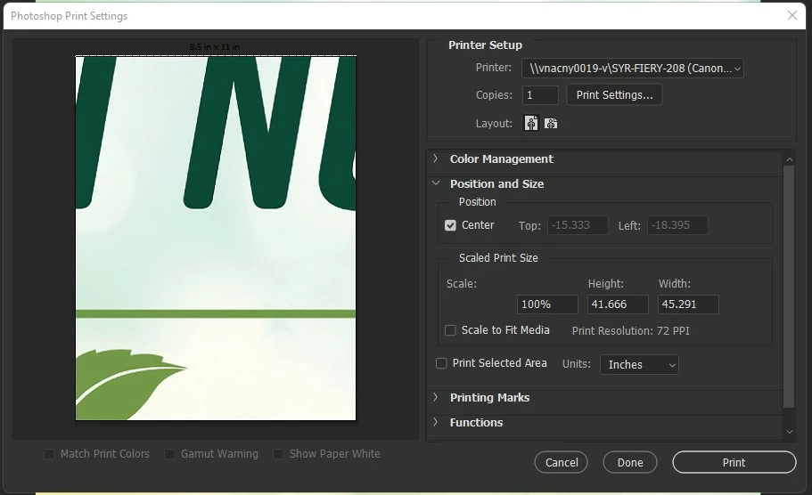 When I hold down the space bar and go to the print dialog box, it resets the preview page size to 8.5 x 11 and changes the dimensions to 41.666 x 45.291. When I go in and update the page size again, it still gives the wrong preview size by a smidge.