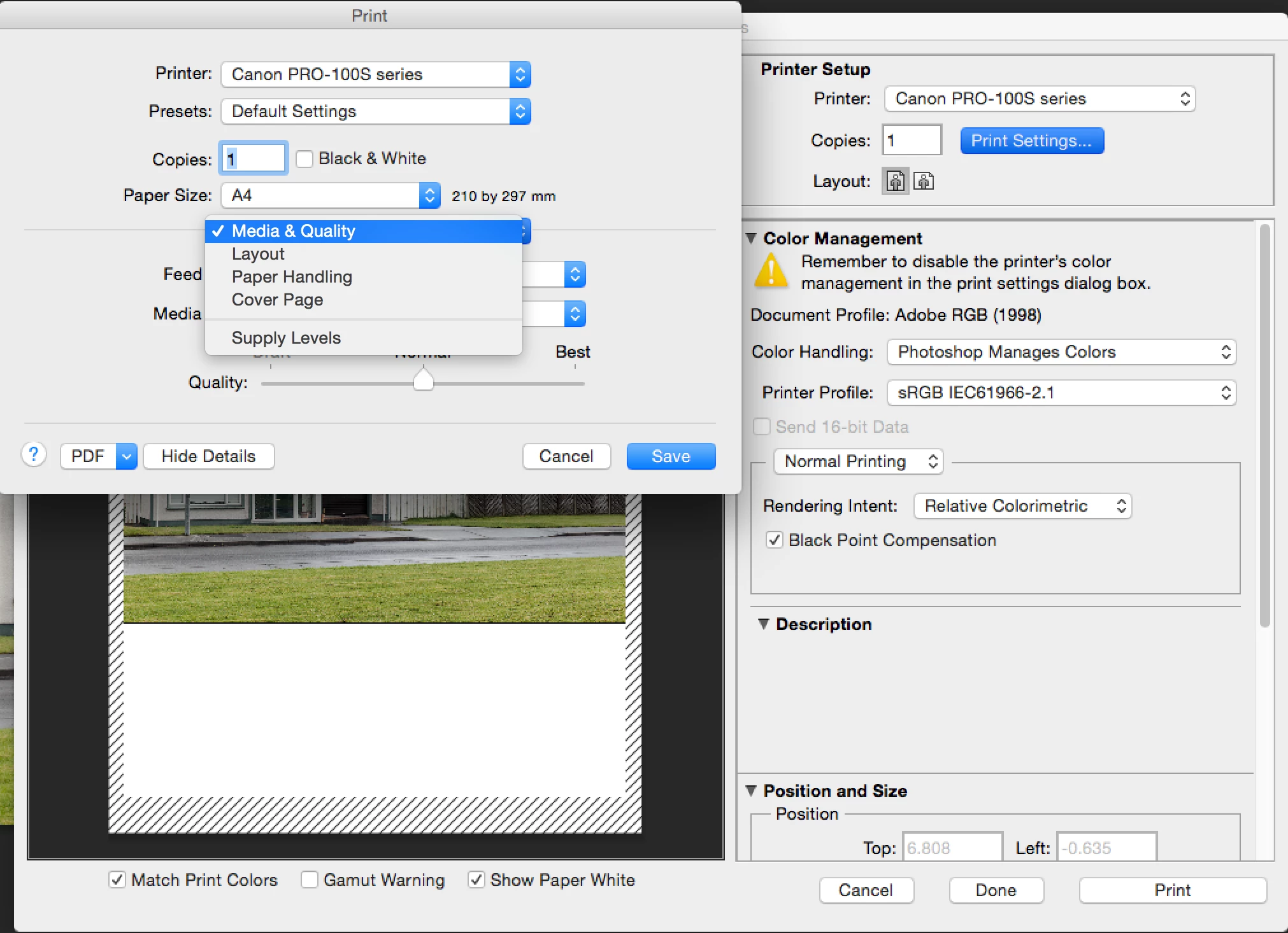 Now, when I open the print settings in photoshop print window, the color option has disappeared and I cannot seem to get the colours right on my prints.