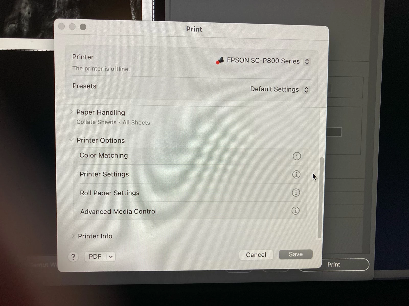 Using MacBook Pro 16", my Print dialog box in Photoshop 2024 v 25.9.1 does not have the “Printer Options” with drop down items of Color Matching, Printer Settings, etc. It has been missing for several versions. When I click on “Print Settings” in the dialog box, a Print dialog box opens with a list of items to set as desired (see first screen capture). However a screen capture from a friend who has an older version of Photoshop 2024 v 25.x.x, shows the item I’m missing (see second image). I have an Epson SureColor P800. I have uninstalled and reinstalled it and I have updated the driver and still no luck. How can I get that “Printer Options” item listed in my Print Settings? Would I have uninstall and reinstall Photoshop, and if so, what is best way to do that?