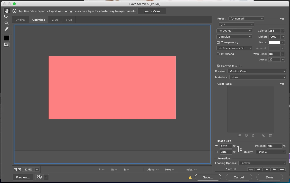I have an 8-sec timeline I would like to make an animated GIF but get a preview error when changing output from PNG to GIF. The preview error is a solid pink screen. I have 11GB of HD space, but this final gif should be less than 4mb. This has happened before but I attributed it to memory resources and just restarted computer. That solution is not working now.